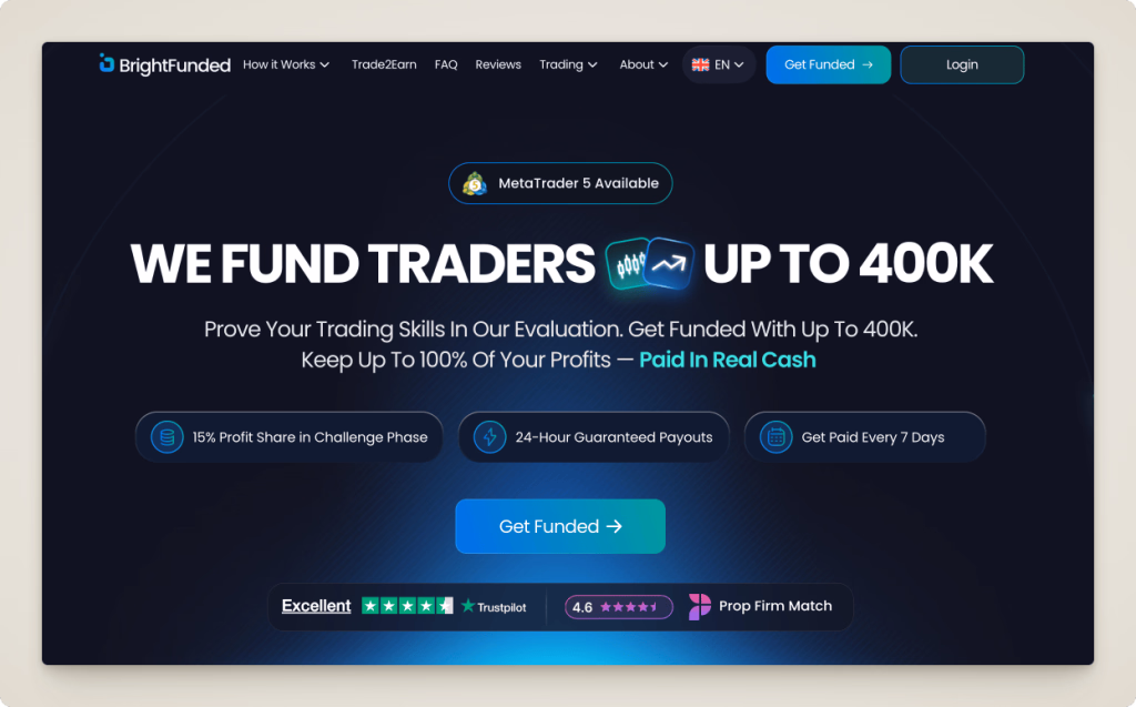 BrightFunded, established in 2023 and headquartered in the Netherlands, offers access to over 40 cryptocurrency pairs alongside forex, indices, and commodities. The firm provides accounts up to $200,000 with an unlimited scaling plan for top performers. Profit splits begin at 80% and can reach 100% as the firm scales.