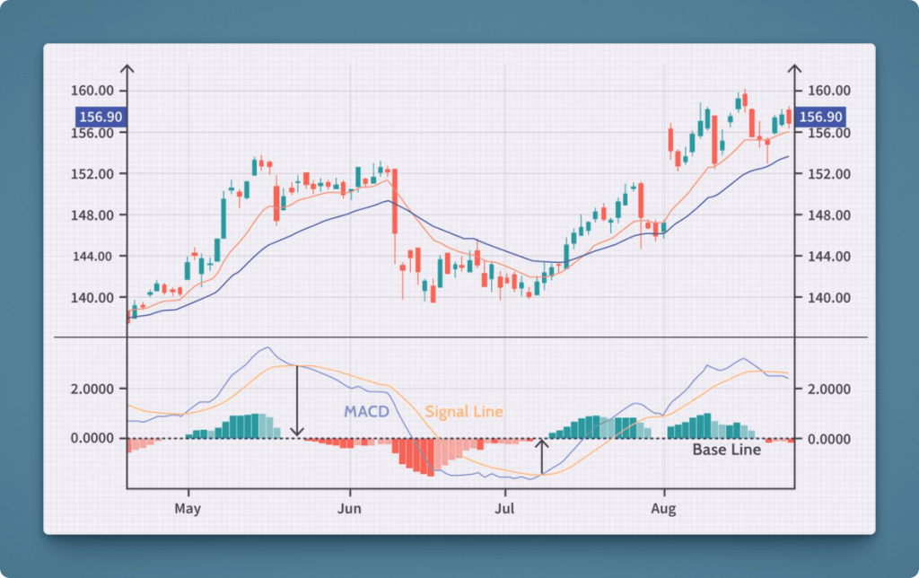 Moving Average Convergence Divergence (MACD): The MACD is an indicator that shows the relationship between two EMAs (typically the 12-day and 26-day) and is used to spot trend changes and momentum shifts. It consists of the MACD line and a signal line – when the MACD line crosses above the signal line, it can be a bullish signal (momentum turning up), and crossing below can be bearish.