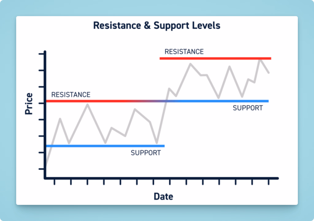 Support and resistance levels are another key concept. Support is a price level where an asset tends to stop falling and bounce back up (due to increased buying interest). Resistance is the opposite – a level where the price often stops rising and may reverse down (due to selling pressure).