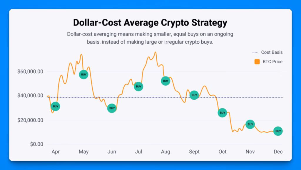 Instead of investing all your money at once, consider spreading it out into several smaller purchases over time. For example, if you have $100, you could buy $25 worth of crypto each week for four weeks. Dollar-cost averaging helps smooth out your purchase price over time and protects you from bad timing. If the price drops after your first buy, you’ll be able to buy at a lower price next time.