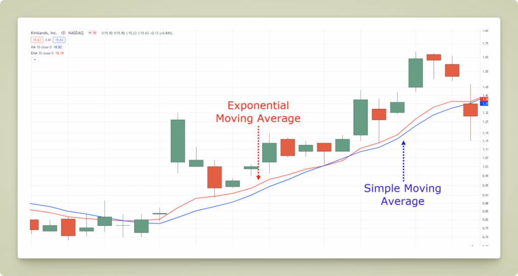 The Exponential Moving Average applies a multiplier that gives recent prices more influence than older ones. The multiplier formula is 2 / (periods + 1), so a 10-period EMA uses a 0.1818 multiplier (2 / 11 = 0.1818).